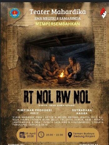 DIKSI.CO – Setelah hampir tujuh tahun tanpa panggung, Teater Mahardika SMAN 8 Samarinda akhirnya kembali menggelar Pentas Tunggal. Pementasan bertajuk “RT Nol RW Nol” karya Iwan Simatupang akan digelar pada Minggu malam, 26 April 2026 di Taman Budaya Kaltim.