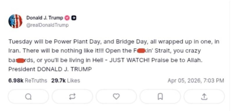“Selasa akan menjadi hari penyerangan pembangkit listrik dan jembatan di Iran. Belum ada serangan seperti ini!!! Buka selatnya… atau kamu akan tinggal di neraka—lihat saja! Segala puji bagi Allah,” tulis Trump dalam unggahan yang menuai kritik luas.